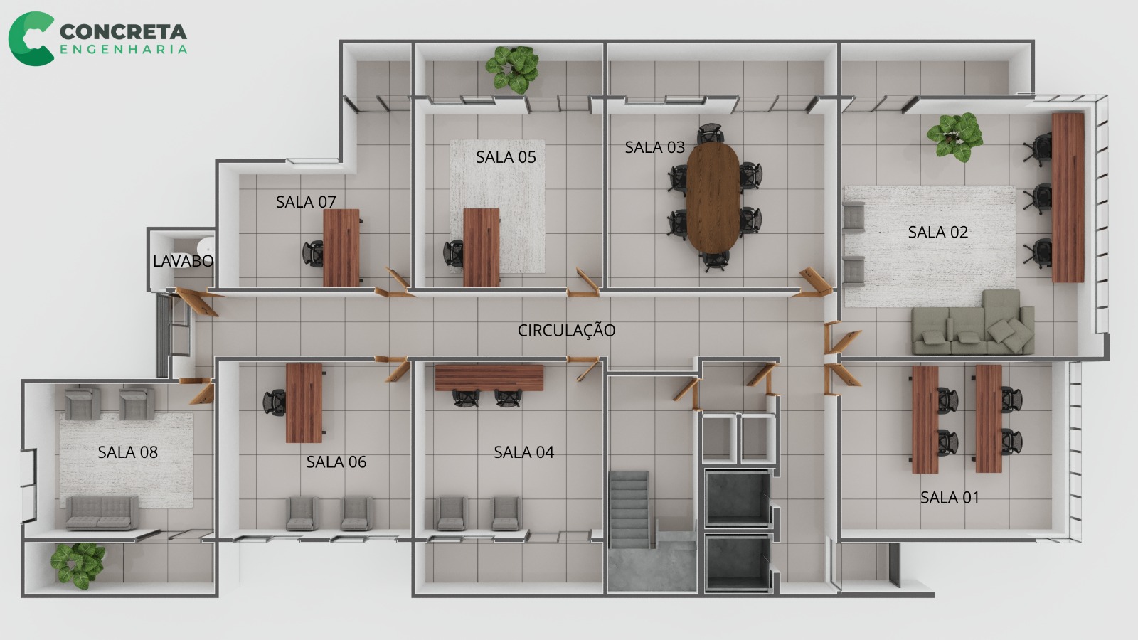 Salas com metragens que variam de 20,06m² a 47,88m² com banheiro privativo.