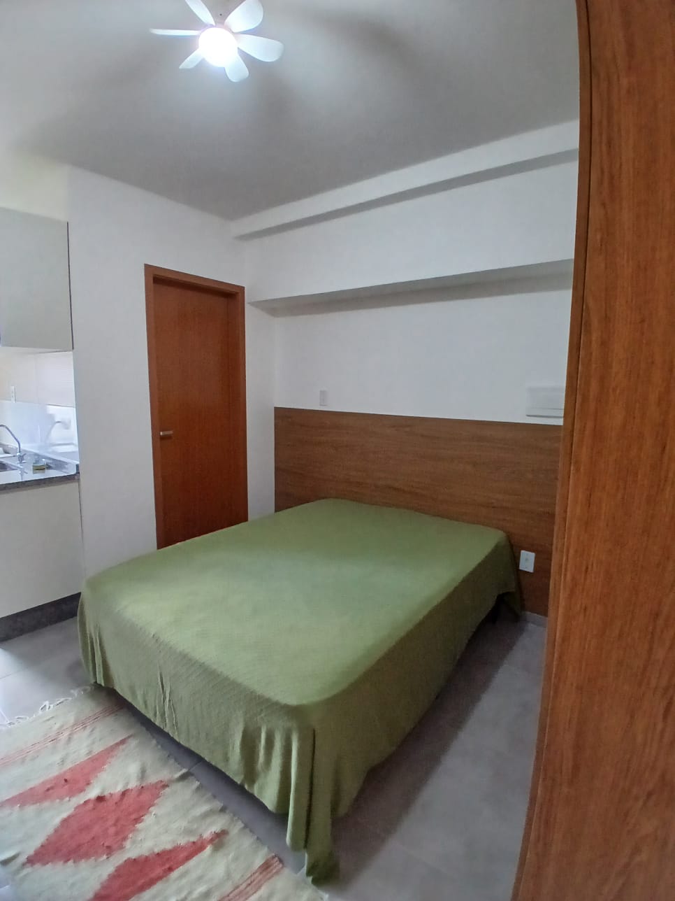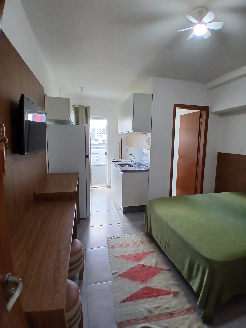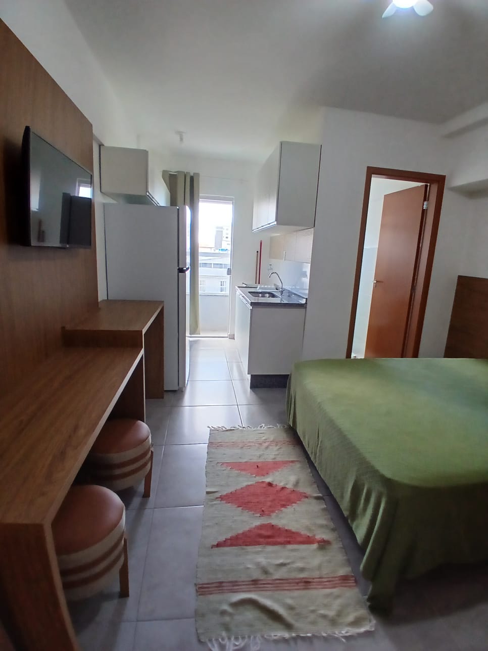 📍 Studio com quarto conjugado à cozinha, varanda, banheiro e área de serviço. Espaço bem distribuído, ideal para quem busca funcionalidade em um ambiente compacto.